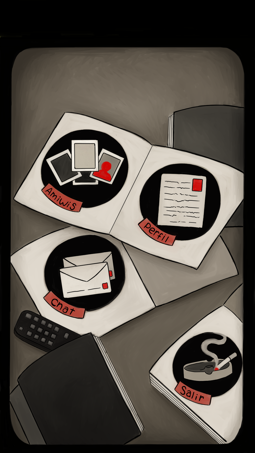 Point and Click Retrofuturistic Noir Novel where a journalist uses a social media app to solve juicy cases.